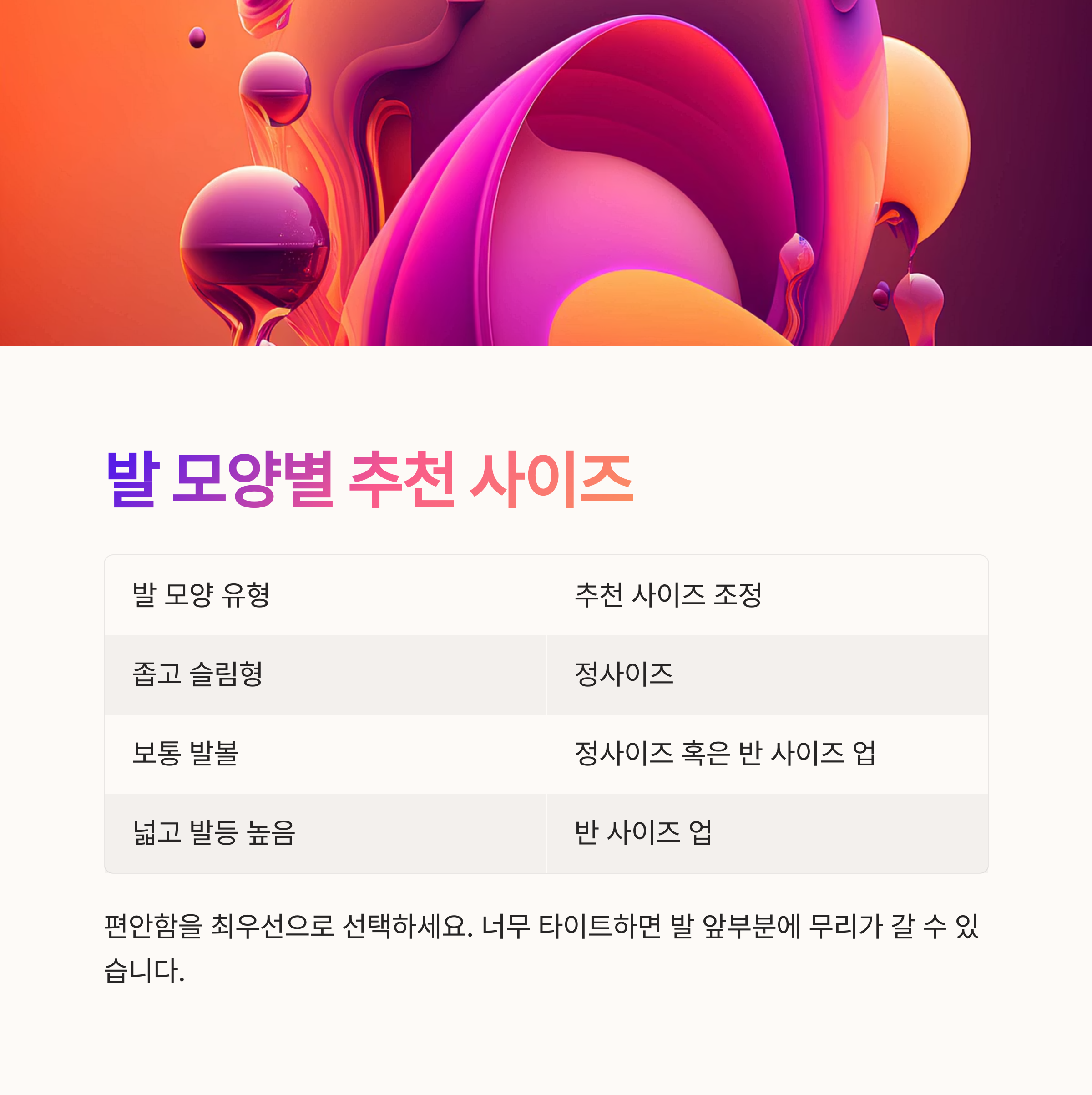| 넓고 발등 높음 | 반 사이즈 업 |