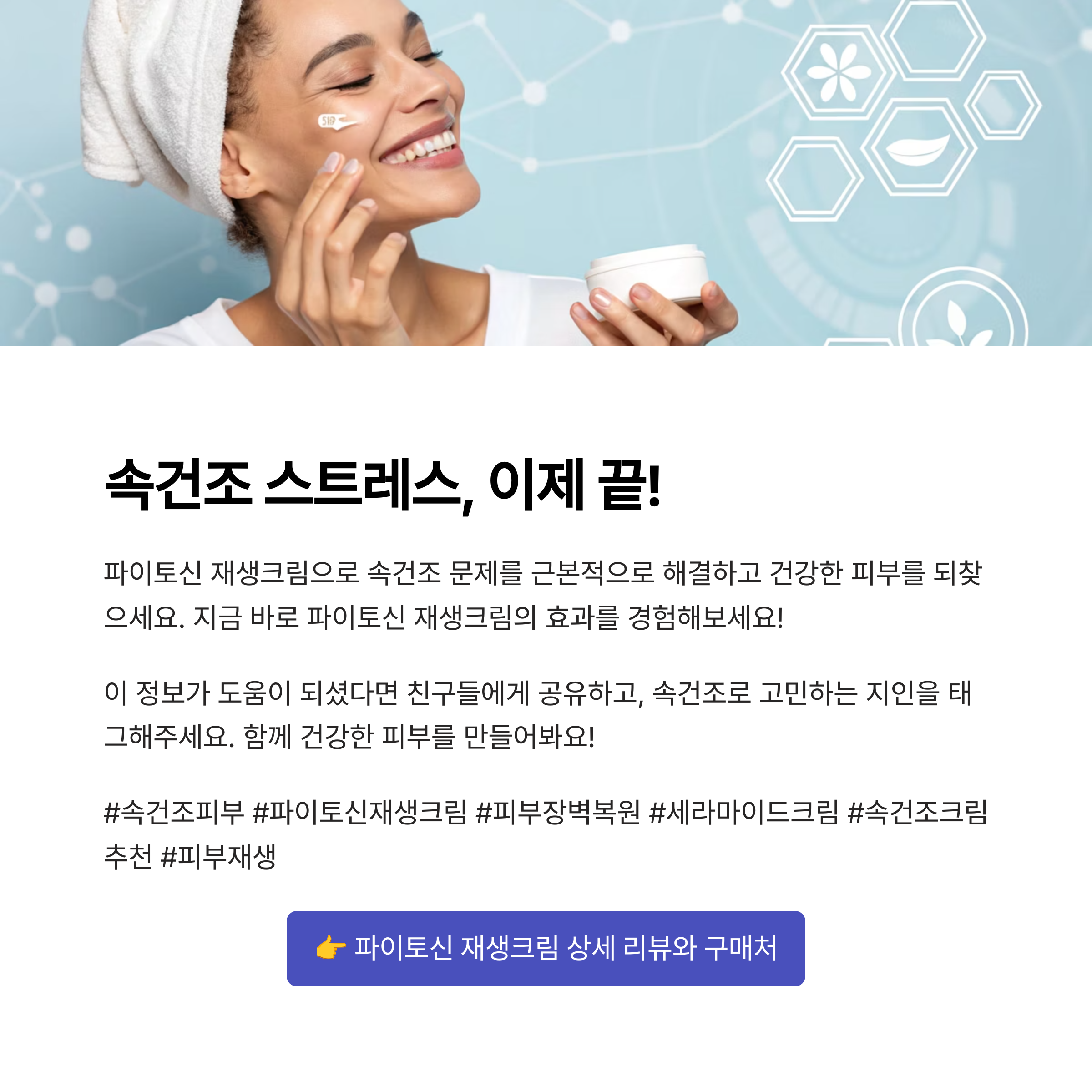 속건조는 피부 겉은 번들거리지만 속은 메말라 푸석푸석한 상태를 말합니다. 이런 상태에서는 수분을 아무리 공급해도 금세 날아가고, 피부 장벽이 약화되어 각질, 트러블, 민감 증상이 쉽게 발생합니다. 파이토신 재생크림은 이런 속건조 문제를 근본적으로 개선하기 위한 크림으로 알려져 있습니다. 본 글에서는 실제 성분 분석을 통해 파이토신 재생크림이 속건조에 어떤 도움을 주는지, 효과가 있는지를 꼼꼼히 파헤쳐 보겠습니다.