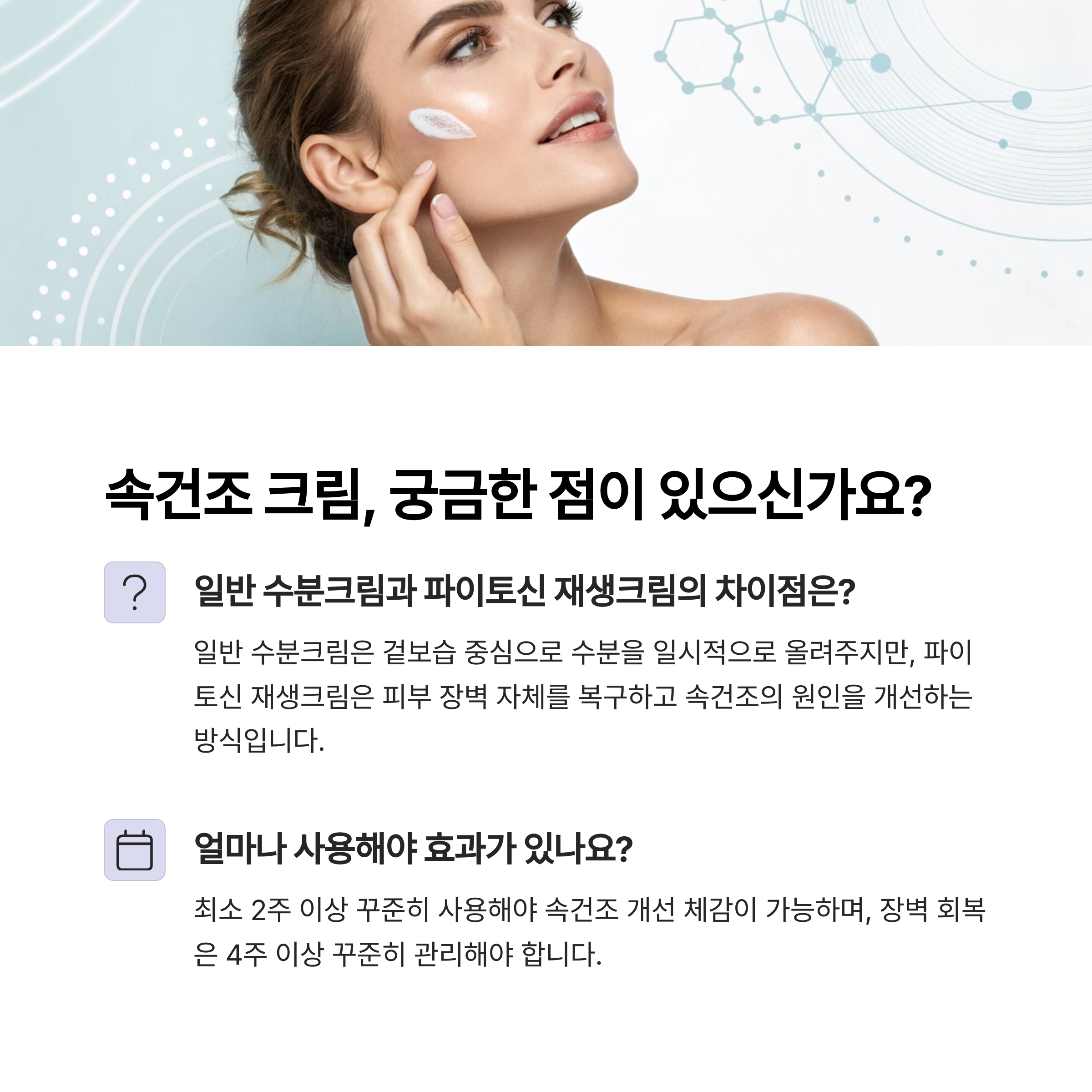 A: 네. 일반 수분크림은 겉보습 중심으로 수분을 일시적으로 올려주지만, 파이토신 재생크림은 피부 장벽 자체를 복구하고 속건조의 원인을 개선하는 방식입니다.